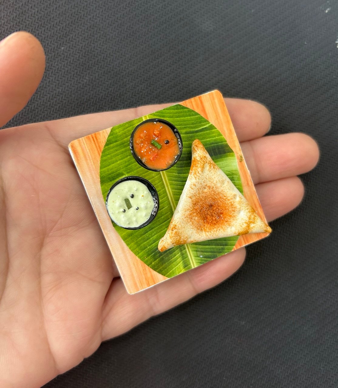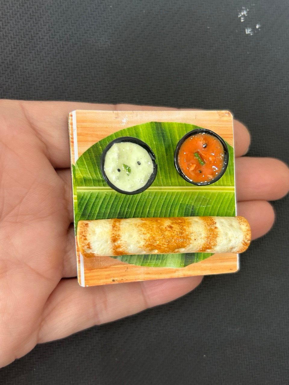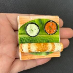 It is an amazing handmade clay miniature magnet creation consisting of yummy masala dosa along with cute bowls filled with sambhar and coconut chutney, arranged over the traditional banana leaf. Every detail of this South Indian delicacy is crafted intricately which ranges from the realistic-looking dosa rings to its authentic texture. It is an awesome creation to own which is extremely adorable with its uniqueness and an equally excellent gifting option for all the foodies out there.
