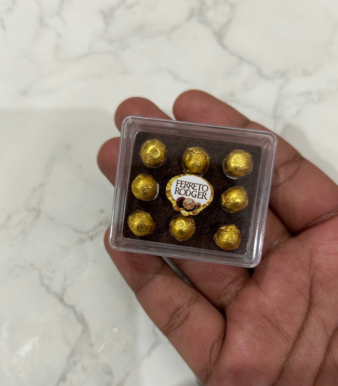 The Miniature Ferrero Rocher is a dollhouse replica of the beloved chocolate treat. The exquisitely detailed design makes it a perfect addition to any miniature collection. Crafted with precision and care, this miniature allows for a realistic and charming touch to any dollhouse setting.