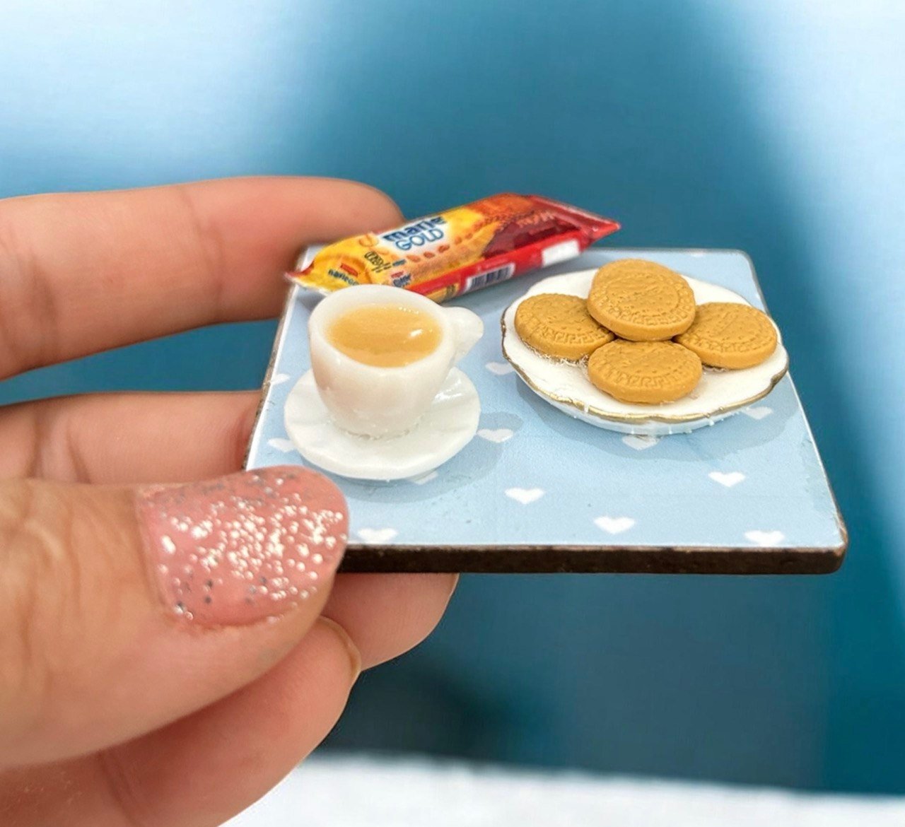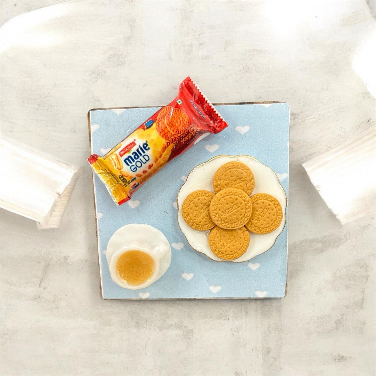 This masterpiece of Marie Gold Biscuits & Tea looks so very real owing to its detailed crafting and coloring. This handmade tiny wonder would be a great surprise for all your dear ones and also a wonderful handmade delight to adorn your premises with !!!