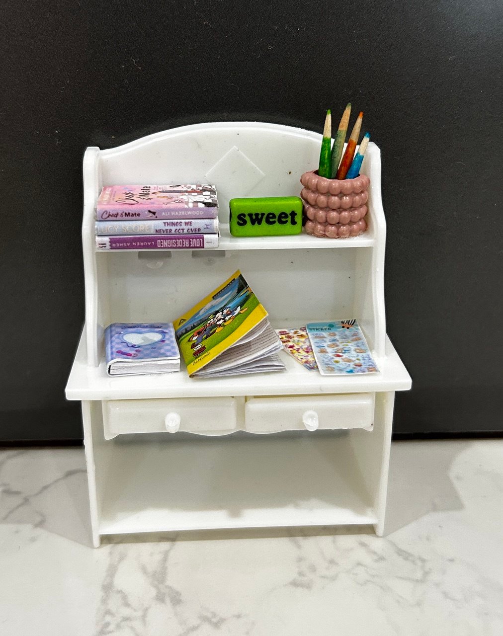 - Educational Value: This doll house furniture includes a study table Books and Drawings, designed to encourage learning and creativity in kid aged 6 to15years; The miniature Study table set helps develop hand-eye coordination and problem-solving skills through imaginative play