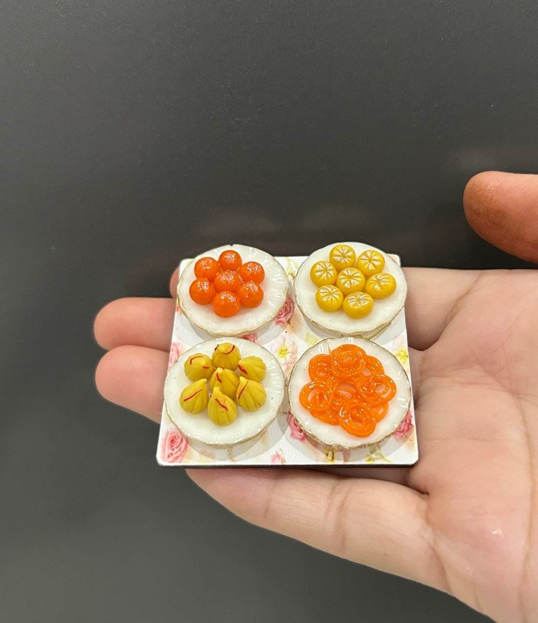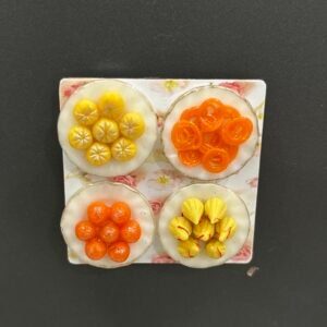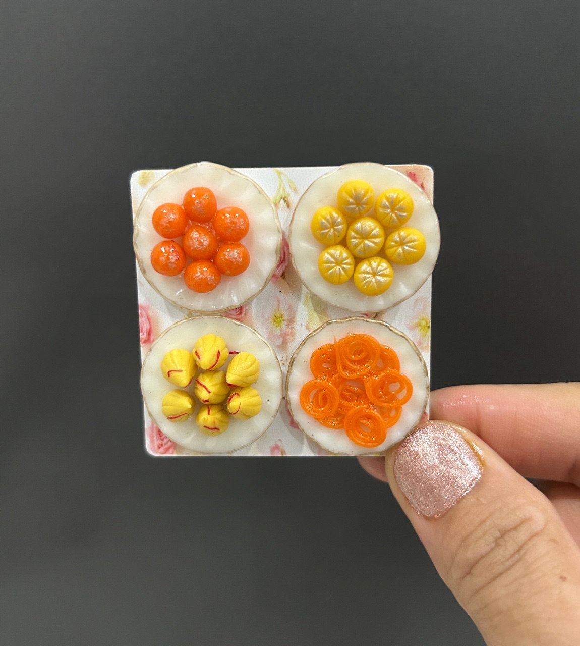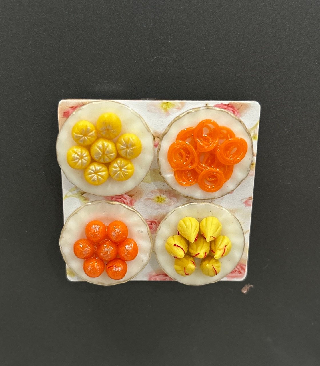 Here is some sweet creation in the form of an adorable miniature magnet. This splendid handmade creation consisting of 4 different varieties of Indian sweets has every detail captured well with the right blend of color, texture and shape. This cute clay food creation would add up to the charm of your home with its presence, apart from brightening up the day of your foodie friends.